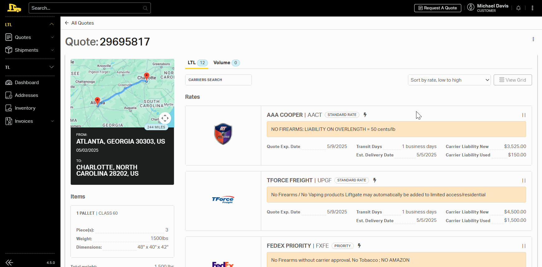 After selecting Get Rates, you’ll see a comprehensive list of LTL carriers you have enabled, with real-time rates based on your shipment details.